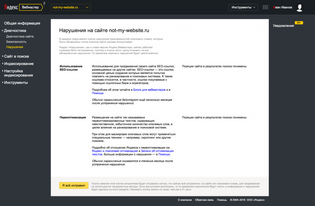 Этот инструмент помогает узнать, не нарушает ли сайт правила поисковой системы. Также будет видно, какие ограничения в ранжировании робот к нему применил. Иногда при продвижении сайта в Поиск Яндекс используются методы, которые искусственно влияют на его ранжирование. За это робот накладывает санкции – понижает позицию сайта в результатах поиска или даже исключает его из поиска. Информацию о возможных ограничениях в ранжировании можно получить в разделе “Нарушения”. Здесь же вы увидите список нарушений, которые робот обнаружил на сайте. Когда проблемы сайта устраняются, нужно нажать на кнопку ”Я все исправил”. Тем самым вы сообщите Яндексу, что нарушений больше нет.