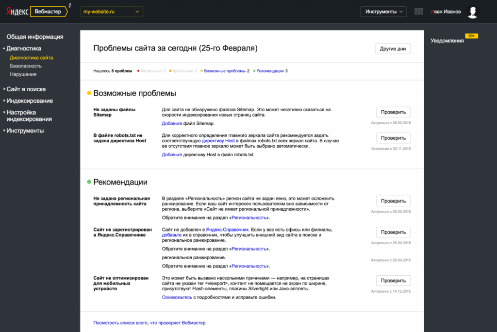 Новая версия сервиса может обнаружить большую часть технических ошибок на вашем веб-ресурсе. Это очень важно, потому что некоторые подобные недочеты могут сильно понизить позиции сайта в поисковой выдаче или даже исключить его из поиска. Новый Яндекс Вебмастер тестирует сайт на 20 технических ошибок и помогает их исправить. Обновленный сервис способен выявить те ошибки, которые ведут к понижению позиций в поисковой выдаче и те, которые так или иначе снижают скорость и качество индексирования сайта. В интерфейсе сервиса указываются эти ошибки и даются советы по их исправлению. Новый Вебмастер также может порекомендовать вам, как улучшить представление сайта в поиске.